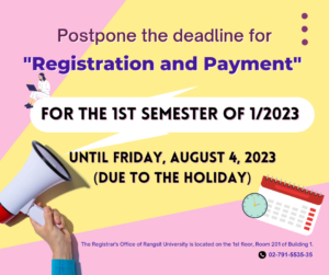 📣Postpone the deadline for “registration and payment” for the 1st semester of 1/2023 until Friday, August 4, 2566 (due to the holiday). ✨